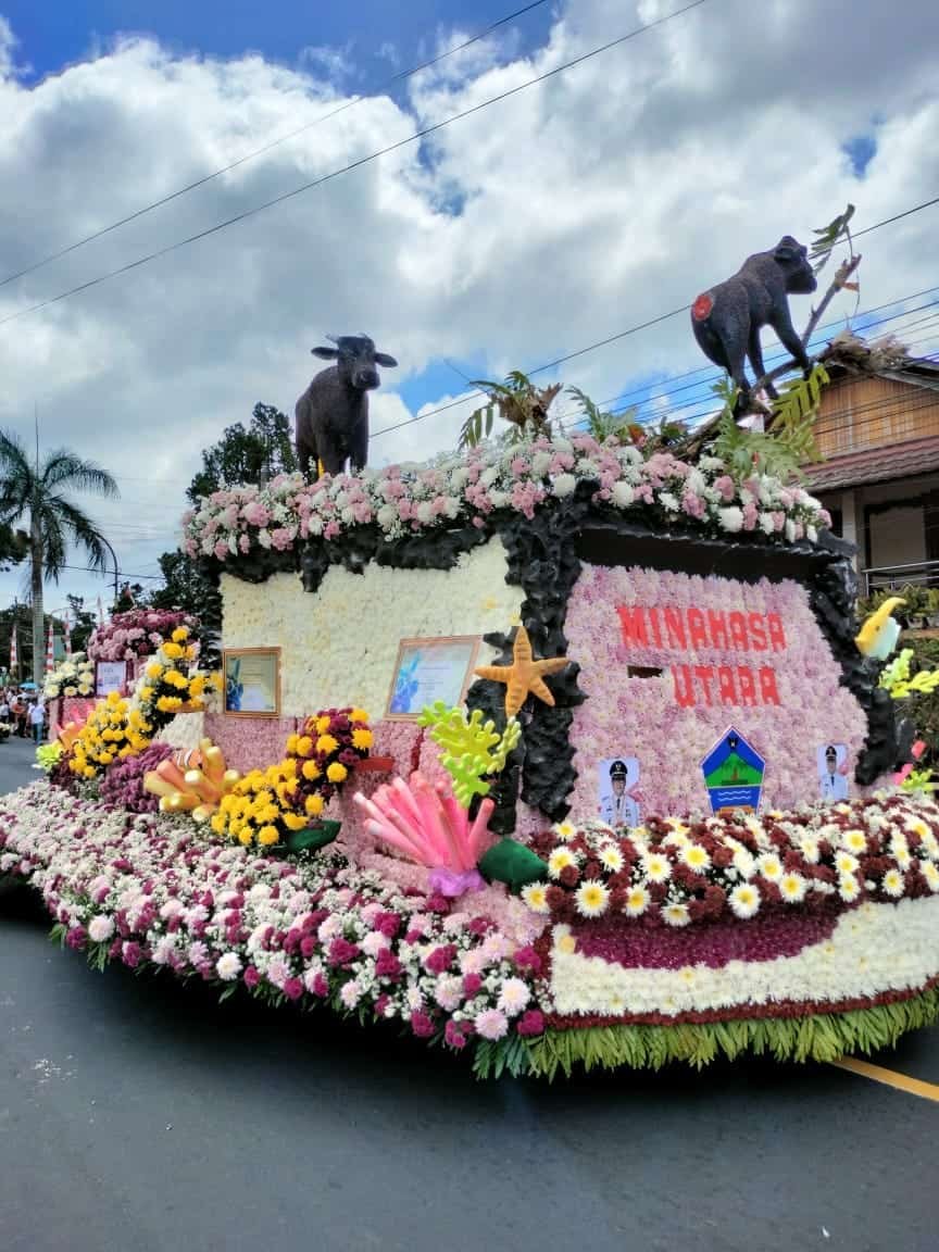 Tomohon is famous as the ‘city of flowers’. Flowers are a part of every journey here, and every year in August (originally every two years) the town hosts a major event called the Tomohon Flower Festival. The festival started in 2008 and in recent years has attracted up to 25,000 people. The main event is the Decorated Float Parade, which features more than 80 spectacular exhibits from cities all over Indonesia and international participants from as far afield as North Korea, Vietnam and even Russia.